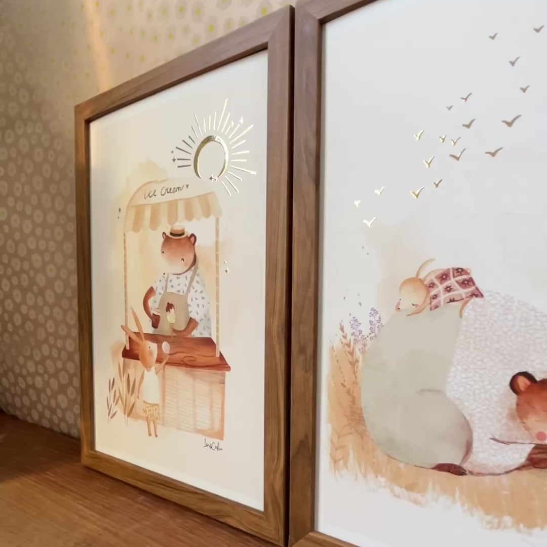 Goudfolie kinderkamer poster set van 3: De Ijsco kar, Het Middagdutje & Mama en Mia Konijn - A3 & A4