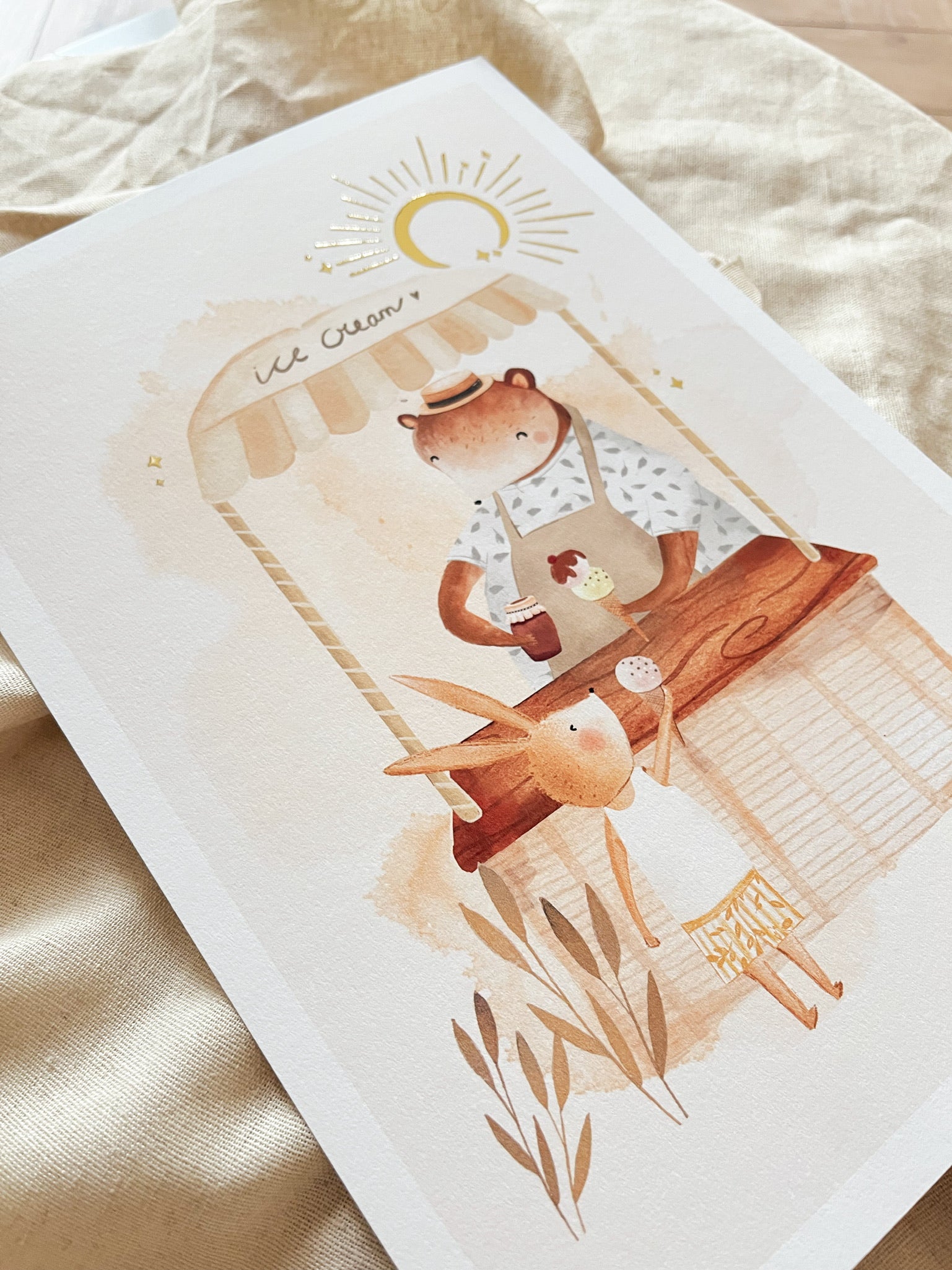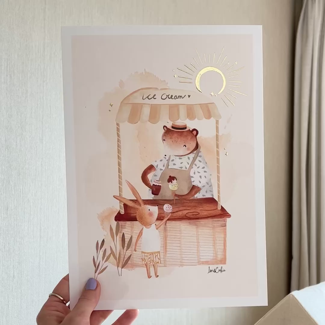 Deze schattige kinderkamer poster met goudfoliehebben we met liefde voor jouw kindje ontworpen en vertelt het verhaaltje van De ijsco kar.Door de schittering van het goudfolie zonnetje, is het een unieke eyecatcher voor bijvoorbeeld boven jouw ledikantje of commode. Creëer eenheid door deze poster te combineren met één van onze andere dierenposters. Zowel in een elegante fotolijst als in een stoere posterstaander is het de perfecte kinderkamer accessoire. Je ontvangt bij iedere poster een gratis Storycard, met het bijpassende voorleesverhaaltje ✨.