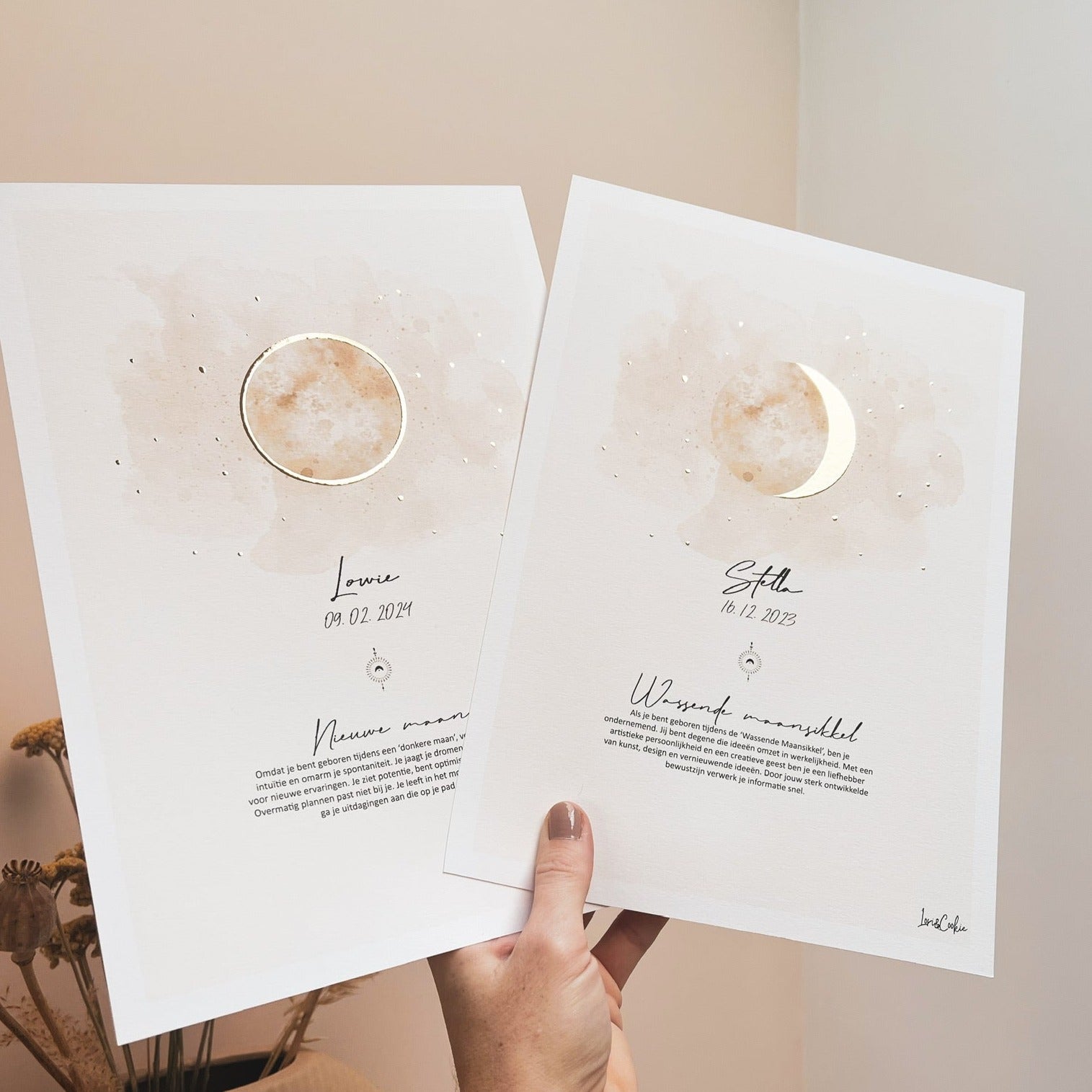 Er zijn in totaal 8 maanstanden. Elke maanstand is anders & heeft een spirituele betekenis. De stand van de maan tijdens de geboorte, vertelt iets over ons karakter. Onze geboorteposters visualiseren de maanfase van jouw kindje en beschrijven de unieke karaktereigenschappen die daarbij horen.