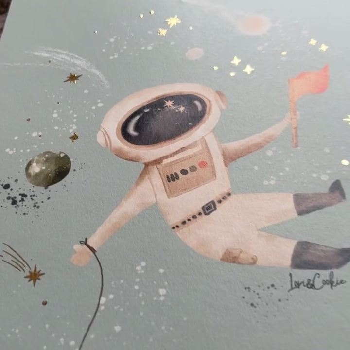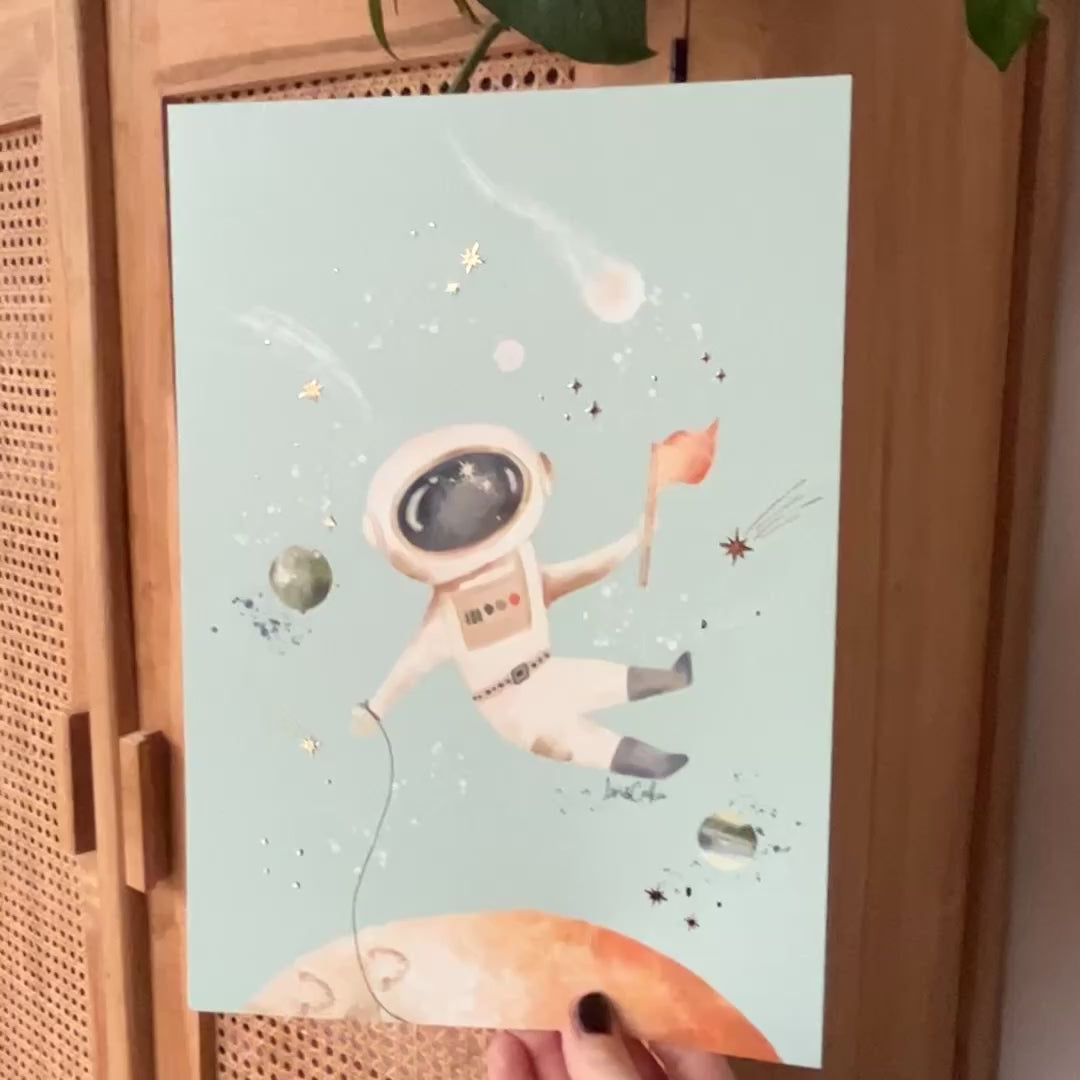 Breng vrolijkheid en kleur in jouw kinderkamer met deze handgeschilderde Astronaut poster in het ruimte thema! De schittering van de goudfolie accenten, gecombineerd met de mooie heldere kleuren, maken van deze poster een prachtige eyecatcher. Deze kleurrijke kinderposter straalt gezelligheid uit en tovert iedere lege wand om tot een vrolijke, stijlvolle blikvanger.